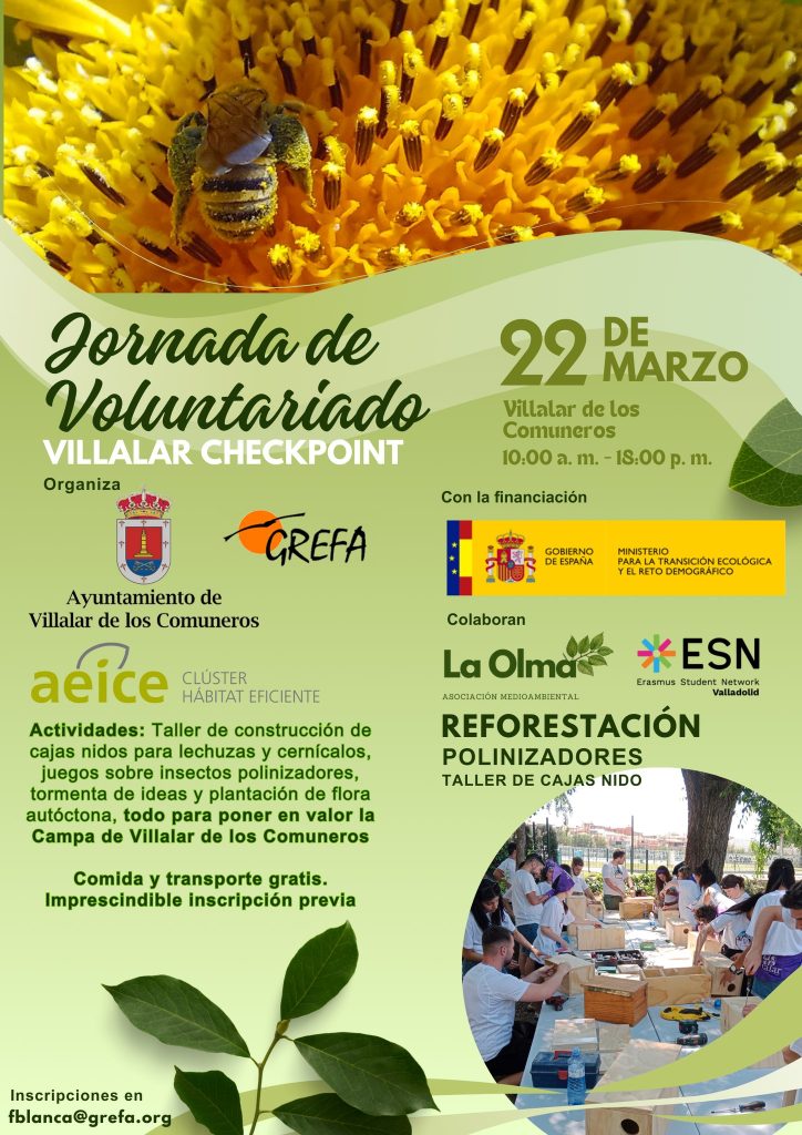 El próximo 22 de marzo, Villalar de los Comuneros se convertirá en un espacio de encuentro y acción para la juventud y todos aquellos interesados en cuidar nuestro entorno. El proyecto Villalar Checkpoint, junto a GREFA, el Ayuntamiento de Villalar, Ágora Villalar y AEICE Clúster de Hábitat Eficiente, organiza una jornada especial de reforestación, cuidado de polinizadores y taller de construcción de cajas nido.